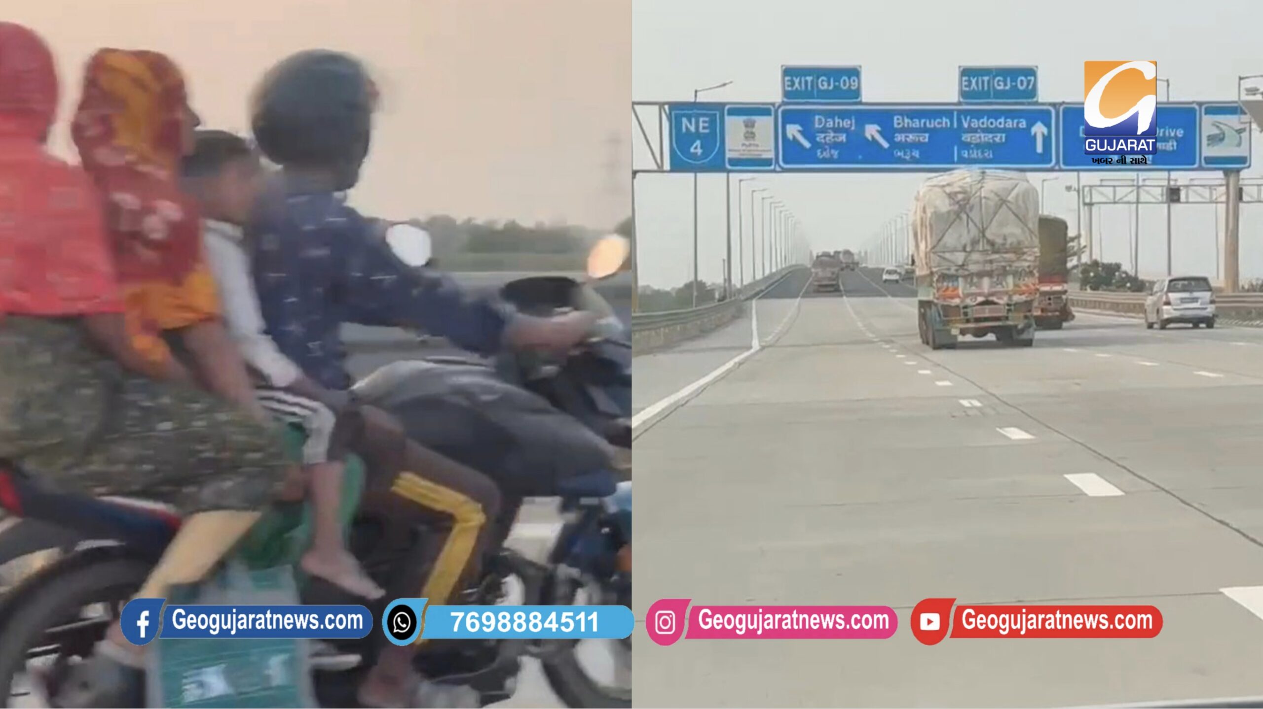 ભરૂચ નજીકના દિલ્હી–મુંબઈ એક્સપ્રેસવે પર ફરી એકવાર ચિંતાજનક ઘટના સામે આવી છે. સોશિયલ મીડિયામાં વાયરલ થયેલા વિડિયોમાં પ્રતિબંધ હોવા છતાં ચાર સવારી સાથે બાઈક હાઈ-સ્પીડ