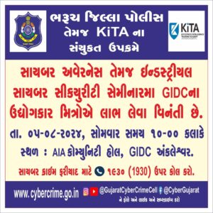 અંકલેશ્વર જીઆઇડીસી મા એઆઇએ કોમ્યુનાટી હોલ ખાતે ભરૂચ જિલ્લા પોલીસ વિભાગ અને કીઝોટ્રિક ઈન્ટેલીજન્સ ટ્રેનીંગ એકેડમી ના ઉપક્રમે સાયબર અવેરનેસ તેમજ ઇન્ડસ્ટ્રીયલ સાયબર સિક્યુરીટી સેમીનારનું આયોજન કરવામાં આવ્યું હતું, અંકલેશ્વરના ડીવાયએસપી ડો.કુશલ ઓઝાના અધ્યક્ષતા હેઠળ યોજાયેલ સાયબર સેમિનારમાં ભરૂચ જિલ્લાની ઔદ્યોગીક વસાહતના પ્રતિનિધિઓ અને વિદ્યાર્થીઓ ઉપસ્થિત રહ્યા હતા.