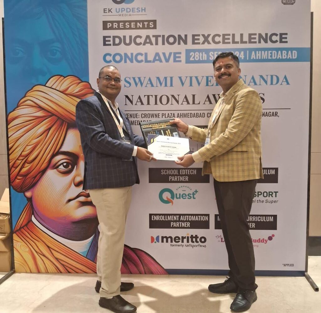 જેના પ્રતિસદમાં આચાર્યએ પોતાના અભિપ્રાય રજૂ કર્યા હતા. આચાર્ય દ્વારા રજુ કરાયેલા અભિપ્રાયને ધ્યાન રાખી કમિટીના સભ્યોએ અત્રેની શાળાના આચાર્ય શ્રી મનોજ કુમાર તિવારીને સ્વામી વિવેકાનંદ નેશનલ પ્રિન્સિપલ એવોર્ડ 2024 થી સન્માનિત કરી તેઓનું અભિવાદન કરવામાં આવ્યું હતુ.