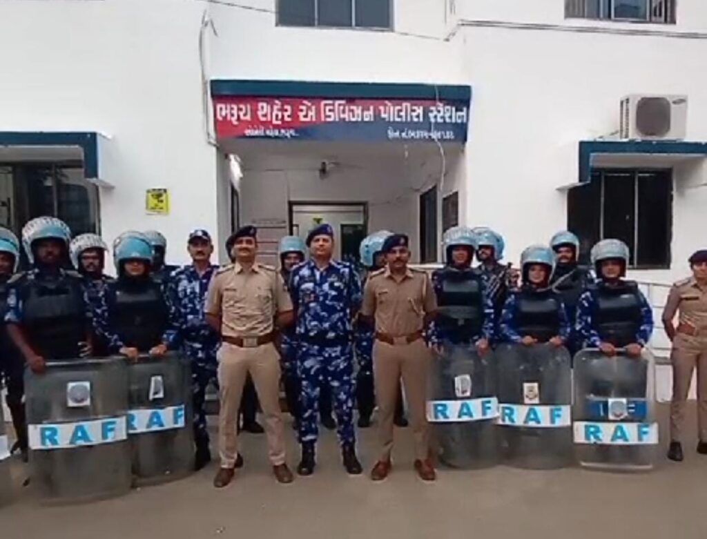ભરૂચ જિલ્લા એસપી મયુર ચાવડાના માર્ગદર્શન હેઠળ આરએએફ મદદનીશ કમાડેન્ટ રાજેશ તિવારીની અધ્યક્ષતામાં જિલ્લાના દરેક પોલીસ મથકો અને તેમના વિસ્તારોની પરિચય મુલાકાત લીધી હતી. જેનો મુખ્ય ઉદ્દેશ જિલ્લાના સંવેદનશીલ અને અતિસંવેદનશીલ વિસ્તારોની મુલાકાત લઈને તેનો ચિતાર મેળવ્યો હતો.આ સાથે જ પોલીસ મથક શાંતીસમિતિના સભ્યો અને વરિષ્ઠ નાગરિકો સાથે વાતચીત કરીને