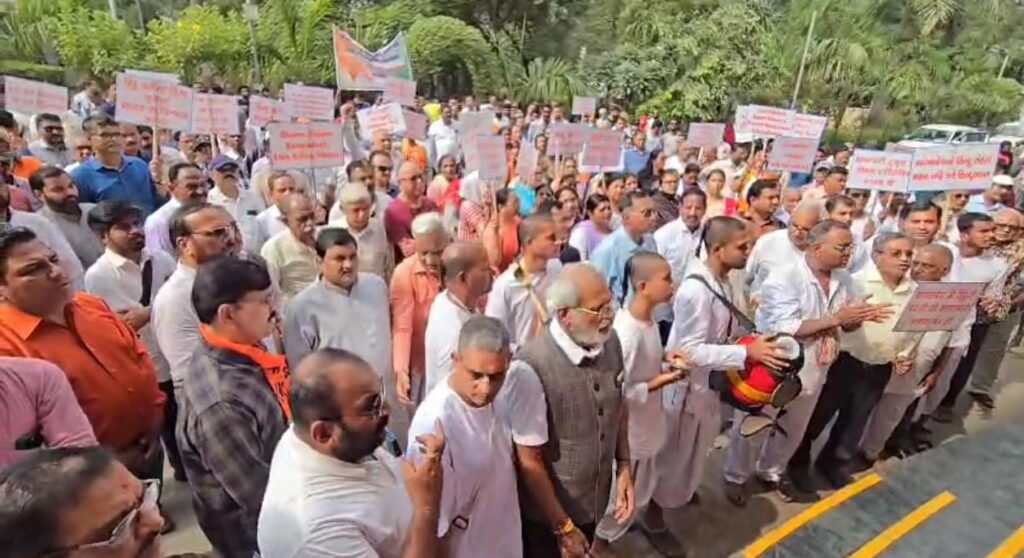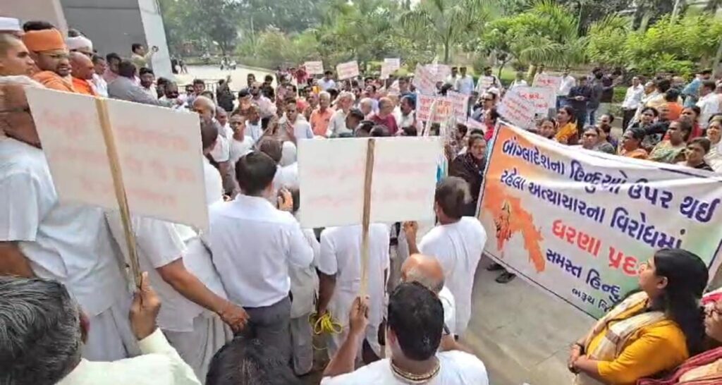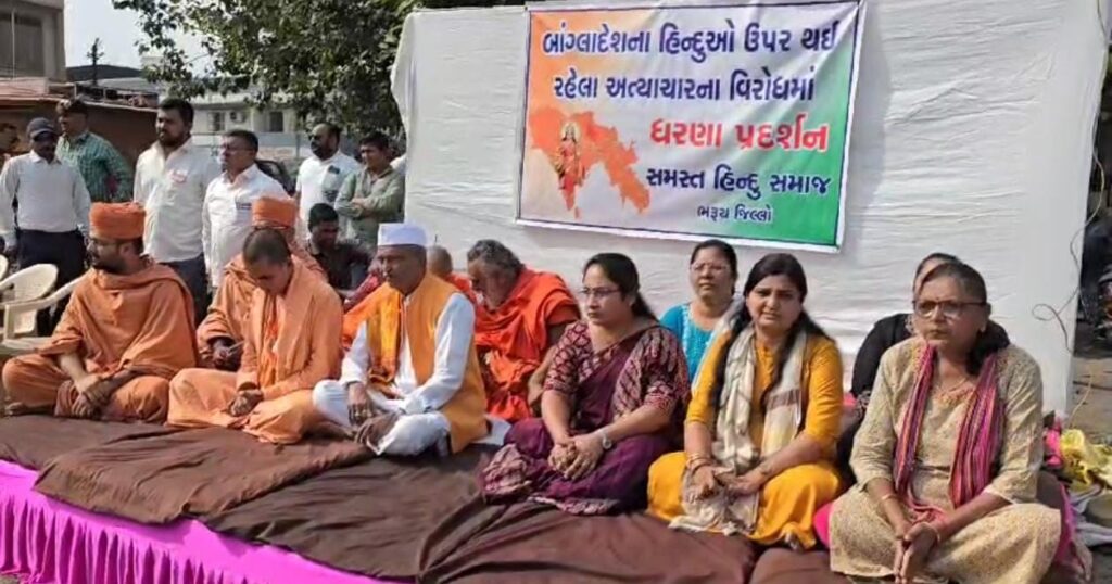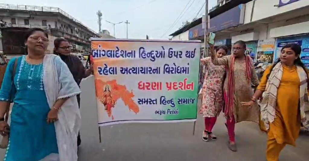 ભરૂચ હિન્દુ સમાજ દ્વારા આજરોજ શક્તિનાથ મંદિર નજીકના ગ્રાઉન્ડમાં ધરણા પ્રદર્શન યોજી રેલી સ્વરૂપે ભરૂચ કલેકટરને આયોજનપત્ર પાઠવી આક્ષેપ સાથે જણાવ્યું હતું કે બાંગ્લાદેશમાં શેખ હસીના સરકારને અલોકતાંત્રિક રીતે બરખાસ્ત કર્યા પછી હિંદુઓ પરના અત્યાચારોમાં ભારે વધારો થયો છે. હિંદુ ધાર્મિક સ્થળોને નિશાન બનાવીને તોડફોડ કરવામાં આવી રહી છે. હિંસા અને હત્યાની ઘટનાઓમાં વધારો થયો છે .અને ધર્મ પરિવર્તન જેવા ગંભીર અપરાધો થઈ રહ્યા છે.