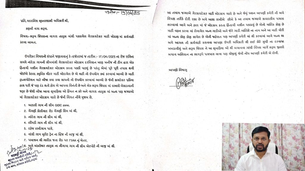 ભરૂચ જિલ્લાને ભુમાફિયાઓથી બચાવવા આમ આદમી પાર્ટી મેદાનમાં:- ઉપરોક્ત કુલ ૮ જગ્યાએ ગેરકાયદેસર માટીખનન ચાલતું હોવાના આક્ષેપ સાથે આમ આદમી પાર્ટીએ ભૂસ્તરશાસ્ત્રીને લેખિતમાં રજુઆત કરી હતી. અને જણાવ્યું હતું, કે આ તમામ જગ્યાએ પણ બેફામ રીતે ગેરકાયદેસર માટીખનન થઈ રહ્યું છે. જેનું અમે વિપક્ષ તરીકે આપની કચેરીનું ધ્યાન દોરી રહ્યા છે. જેથી આ તમામ જગ્યાએ નિષ્પક્ષ રીતે કાયદેસરની કાર્યવાહી કરવાની આશા વ્યક્ત કરાઈ છે. અને જો આમ કરવામાં નહીં આવે તો આમ આદમી પાર્ટીએ ભરૂચ જિલ્લાને ભુમાફિયાઓથી બચાવવા ગાંધી ચીંધ્યા માર્ગે ભરૂચ જિલ્લો બચાવ અભિયાનના ભાગરૂપે પગપારા યાત્રા યોજાવાની તૈયારી પણ બતાવી છે. હવે જોવું એ રહ્યું કે, આમ આદમી પાર્ટીની રજુઆત બાદ મદદનીશ ભૂસ્તર શાસ્ત્રી, અધિકારી શુ કાર્યવાહી કરે છે.