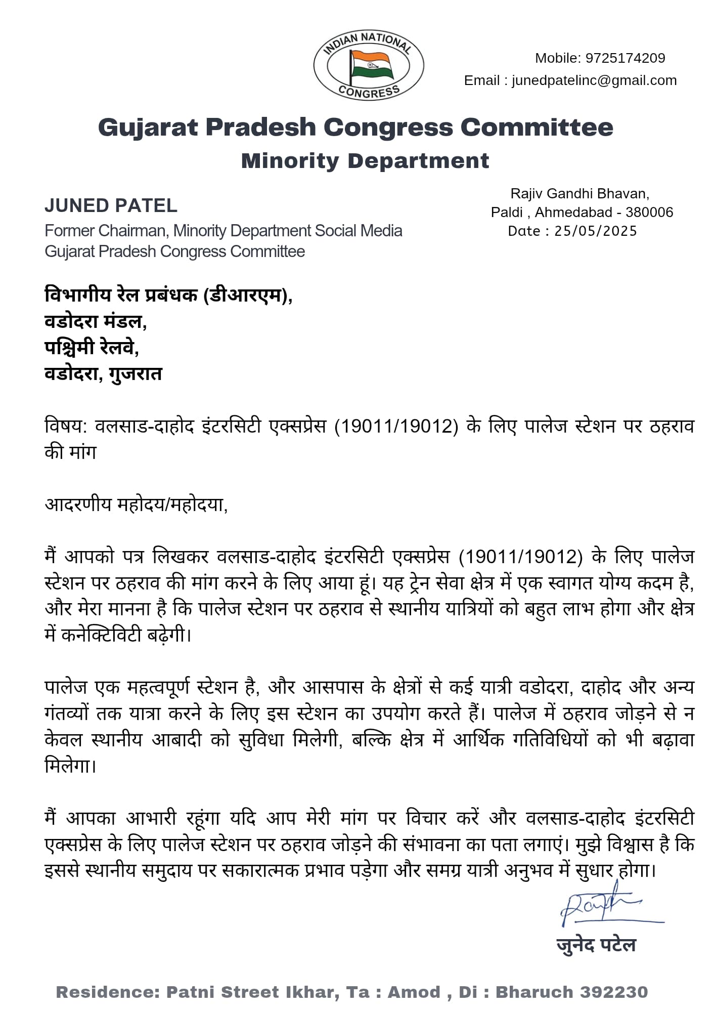 તા ૨૭/૦૫/૨૦૨૫ ના શરૂ થનાર ૧૯૦૧૧/૧૯૦૧૨ વલસાડ દાહોદ ઇન્ટરસિટીને પાલેજ (PLJ) રેલ્વે સ્ટેશન ખાતે સ્ટોપેજ આપવા માટે ડી.આર.એમ વડોદરાને ગુજરાત પ્રદેશ કોંગ્રેસ સમિતિ લઘુમતી વિભાગ સોશિયલ મીડિયાના પુર્વ ચેરમેન જુનેદ પટેલ દ્વારા પત્ર લખીને રજૂઆત કરવામાં આવી હતી. જેમાં જણાવાયું છે, કે પાલેજ એક મહત્વપૂર્ણ સ્ટેશન છે. અને પાલેજ સ્ટોપેજ આપવાથી આસપાસના ગામના વડોદરા, દાહોદ સહિતના મુસાફરોને રાહત થશે, વધુમાં રેલવે વિભાગને પણ આર્થિક ફાયદો થશે તેમ જણાવ્યું છે.