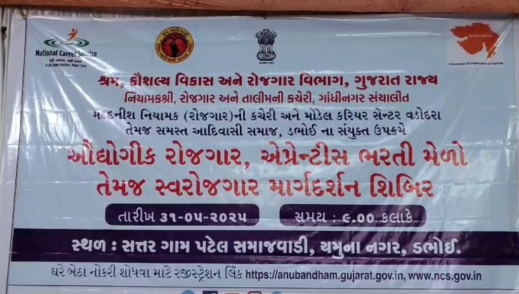મોડલ કરિયર સેન્ટર, મદદનીશ નિયામક (રોજગાર)ની કચેરી વડોદરા અને સમસ્ત આદિવાસી સમાજ, ડભોઈ ના સંયુકત ઉપક્રમે સતરગામ પટેલ સમાજની વાડી, યમુનાનગર ડભોઇ ખાતે તમામ કેટેગરીના ઉમેદવારો માટે ઓદ્યોગિક રોજગાર અને એપ્રેન્ટીસ ભરતી મેળો અને સ્વરોજગાર માર્ગદર્શન શીબીર યોજવામા આવી . જેમાં વડોદરા જીલ્લાના ૧૫ જેટલા નોકરીદાતા દ્વારા ૫૦૦ થી વધુ ટેકનીકલ અને નોન ટેકનીકલ જગ્યા માટે ઈન્ટરવ્યુ લેવા હાજર રહ્યા હતા . જેમા દિવ્યાંગ ઉમેદવારો માટે ૩૦ થી વધારે જગ્યા માટે ૨ નોકરીદાતા હાજર રહ્યા હતા .