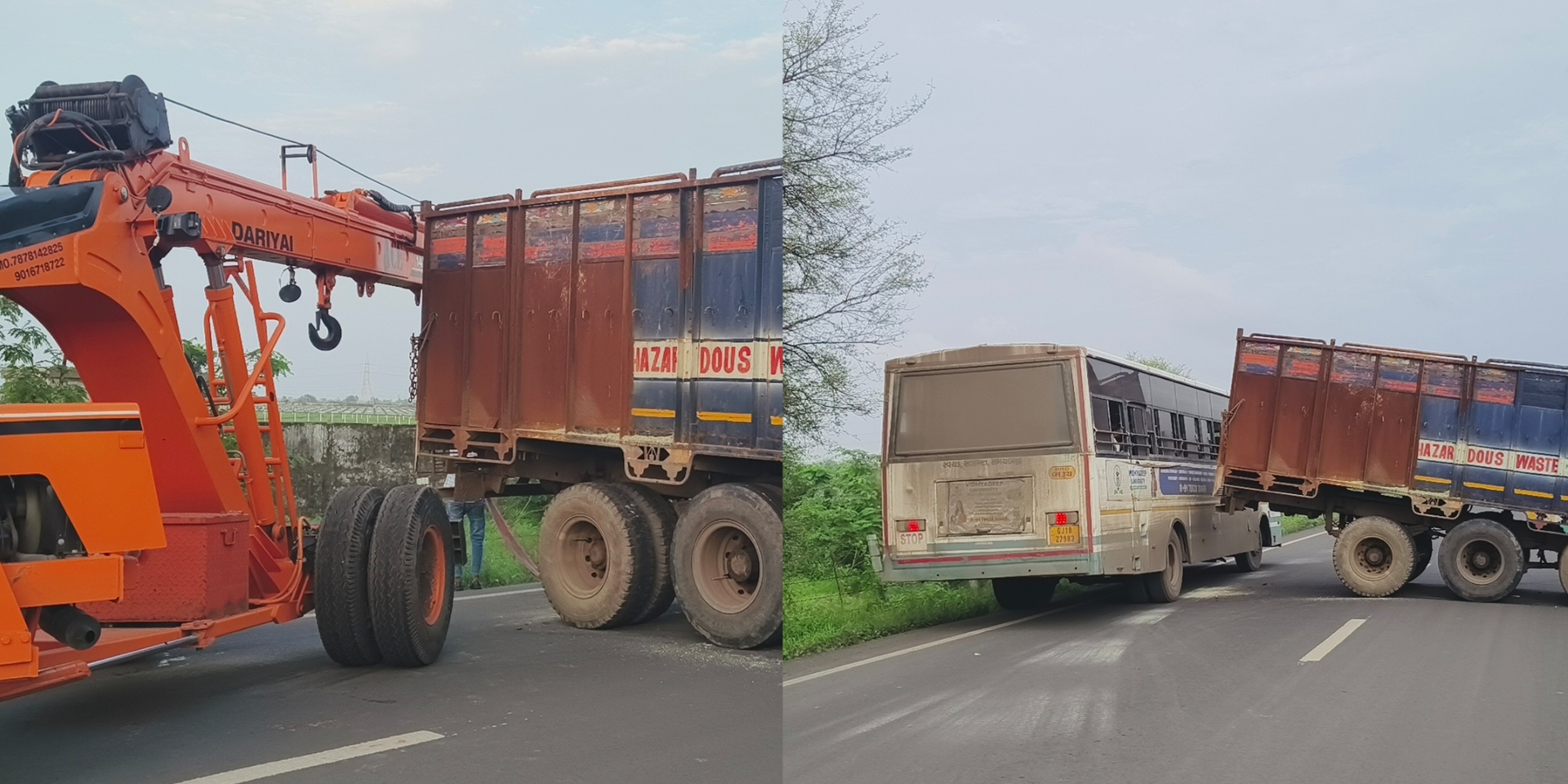 હેઝાર્ડસ વેસ્ટની એક ટ્રક નંબર GJ-12-AU-9419 જે વાગરાથી ભરૂચ તરફ જઈ રહી હતી. તે દરમિયાન CISF કોલોની નજીક કોઈક કારણોસર ચાલક ટ્રક પરત વાગરા તરફ લઇ જવા માટે યુ-ટર્ન કરી રહ્યો હતો. તે વેળાએ ટ્રકના આગળના ટાયર રોડની નીચે ઉતરી જતા કિચડને કારણે ટાયર જામ થઈ જતા ટ્રક રોડ વચ્ચેજ આડી થઈ ગઈ હતી.