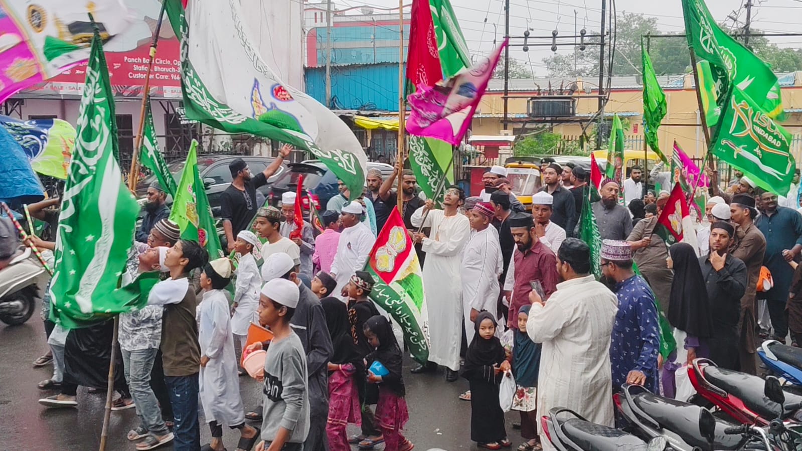 વરસાદ પણ ન રોકી શક્યો ઉત્સાહ, ભરૂચમાં ઇદે મિલાદની શાનદાર ઉજવણી, પોલીસનો ચુસ્ત બંદોબસ્ત. : આકાશમાંથી વરસી રહેલા વરસાદની પણ શ્રદ્ધાળુઓના ઉત્સાહ પર કોઈ અસર થઈ ન હોતી. નાના બાળકોથી માંડીને યુવાનો અને વડીલો સુધી સૌએ એકસાથે આ જુલુસમાં ભાગ લીધો હતો. રંગબેરંગી ઝંડાઓ, ધાર્મિક નારાઓ અને નાત શરીફના ખુશનુમા માહોલથી આખું વાતાવરણ ગુંજી ઉઠ્યું હતું. આ કાર્યક્રમ દરમિયાન કોઈ અનિચ્છનીય ઘટના ન બને તે માટે પોલીસ વિભાગ દ્વારા પણ ચુસ્ત બંદોબસ્ત ગોઠવવામાં આવ્યો હતો.