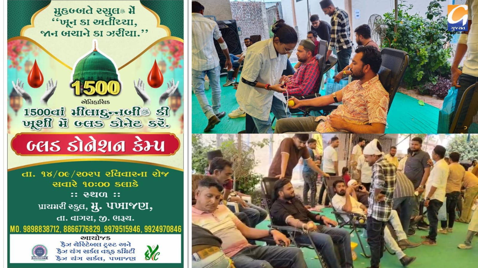 ફેઝ ચેરિટેબલ ટ્રસ્ટ અને ફેઝ યંગ સર્કલ દ્વારા આયોજિત આ કેમ્પમાં યુવાનોએ મોટી સંખ્યામાં રક્તદાન કર્યું. : વાગરા તાલુકાના પખાજણ સ્થિત આવેલી પ્રાયમરી સ્કૂલ ખાતે હુઝુર સલ્લલ્લાહુ અલયહી વસલ્લમના જન્મદિવસની પવિત્ર ઉજવણીના ભાગરૂપે એક અનોખો અને પ્રેરણાદાયક કાર્યક્રમ યોજાયો હતો. ફૈઝ ચેરીટેબલ ટ્રસ્ટ અને ફૈઝ યંગ સર્કલ દ્વારા પીરે તરીકત સૂફી એ મિલ્લત અલ્હાજ સૈયદ મુસ્તાક અલી બાવા સાહેબની પ્રેરણાથી અને ખલિફએ સૂફી એ મિલ્લત સૈયદ વાહિદ અલી બાવા સાહેબના માર્ગદર્શન હેઠળ આ ભવ્ય બ્લડ ડોનેશન કેમ્પનું આયોજન કરવામાં આવ્યું હતું. આ ધાર્મિક અને સામાજિક કાર્યક્રમમાં ગામ સહિત આસપાસના ગામોના હિન્દુ-મુસ્લિમ સમાજના યુવાનો મોટી સંખ્યામાં ઉમટી પડ્યા હતા. અને માનવતાનું ઉત્તમ ઉદાહરણ પૂરું પાડ્યું હતું. બ્લડ ડોનેશન કેમ્પનો મુખ્ય ઉદ્દેશ્ય લોકોમાં રક્તદાન પ્રત્યે જાગૃતિ ફેલાવવાનો અને જરૂરિયાતમંદ દર્દીઓને મદદ કરવાનો હતો. આયોજકોએ જણાવ્યું હતું કે, એકત્રિત થયેલું રક્ત થેલેસેમિયાથી પીડિત બાળકો અને અન્ય ગંભીર દર્દીઓના જીવન બચાવવામાં અત્યંત મદદરૂપ થશે. રક્તદાન એટલે લોહીનું દાન જે કોઈ પણ સ્વસ્થ વ્યક્તિ દ્વારા કરવામાં આવતું એક મહાન કાર્ય છે. આ પ્રવૃત્તિ માત્ર એક દાન નથી, પરંતુ તે જીવન બચાવવાની પ્રક્રિયા છે. રક્તદાનનું મહત્વ એટલું ઊંડું છે કે તેને શબ્દોમાં વર્ણવવું મુશ્કેલ છે. તે એક એવી ભેટ છે જેનું કોઈ મૂલ્ય આંકી શકાતું નથી.