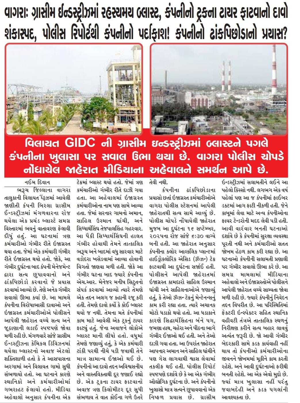 કંપનીનો ટ્રકનું ટાયર ફાટવાનો દાવો શંકાસ્પદ, પોલીસ ચોપડે સત્યનો પર્દાફાશ. : ભરૂચ જિલ્લાના વાગરા તાલુકાની વિલાયત GIDCમાં આવેલી જાણીતી કંપની બિરલા ગ્રાસીમ ઈન્ડસ્ટ્રીઝમાં મંગળવારના રોજ થયેલા એક પ્રચંડ બ્લાસ્ટે સમગ્ર વિસ્તારમાં ભયનું વાતાવરણ ફેલાવી દીધું હતું. આ ઘટનામાં ત્રણ કર્મચારીઓ ગંભીર રીતે ઇજાગ્રસ્ત થયા હતા. જેમાં એક કર્મચારી ગંભીર રીતે ઇજાગ્રસ્ત થયો હતો. જોકે, આ ગંભીર દુર્ઘટના બાદ કંપની મેનેજમેન્ટ દ્વારા સત્ય છુપાવવાનો અને ઢાંકપિછોડો કરવાનો જે પ્રયાસ કરવામાં આવ્યો છે. તેણે અનેક ગંભીર સવાલો ઊભા કર્યા છે. આ મામલે કંપનીના વિરોધાભાસી દાવાઓ અને ઇજાગ્રસ્ત કર્મચારીઓએ પોલીસને આપેલી જાહેરાત વચ્ચે સત્ય અને જૂઠાણાની લડાઈ સ્પષ્ટપણે જોવા મળી રહી છે.ટ્રકના ટાયર ફાટવાનો અવાજ ૩ કિલોમીટર દૂર સુધી?, ગ્રાસીમ ઈન્ડસ્ટ્રીઝના મેનેજરનો ખુલાસો હાસ્યાસ્પદ! : મંગળવારે સાંજે ગ્રાસીમ ઈન્ડસ્ટ્રીઝના કેમિકલ ડિવિઝનમાં થયેલા બ્લાસ્ટનો અવાજ એટલો શક્તિશાળી હતો કે તે આસપાસના અરગામાં અને વિલાયત ગામો સુધી સંભળાયો હતો. આ ઘટનાને કારણે સ્થાનિકો અને કર્મચારીઓમાં ગભરાહટ ફેલાયો હતો. મીડિયા અહેવાલો અનુસાર કંપનીના એક ટેન્કમાં બ્લાસ્ટ થયો હતો. જેમાં ત્રણ કર્મચારીઓ ગંભીર રીતે દાઝી ગયા હતા. આ અહેવાલમાં ઇજાગ્રસ્ત કર્મચારીઓના નામ પણ સામે આવ્યા હતા. જેમાં સરનાર ગામનો અમાન, સાહિલ ઉસ્માન ઘાંચી, અને સિધ્ધાર્થસિંઘ તેજપાલસિંહ ગહરવાર. આ પૈકી સિધ્ધાર્થસિંઘની હાલત ગંભીર હોવાથી તેમને તાત્કાલિક ભરૂચ અને બાદમાં વધુ સારવાર માટે વડોદરા ખસેડવામાં આવ્યા હોવાની વિગતો જાણવા મળી હતી. જોકે આ ગંભીર ઘટના બાદ જ્યારે કંપનીના એચ.આર. મેનેજર મનીષ સિટુતનો સંપર્ક કરવામાં આવ્યો ત્યારે તેમણે એક તદ્દન અલગ જ કહાની રજૂ કરી હતી. તેમણે દાવો કર્યો કે કોઈ બ્લાસ્ટ થયો જ નથી. તેમના મતે કંપનીમાં કામ માટે આવેલી એક ટ્રકનું ટાયર ફાટ્યું હતું. જેના અવાજને લોકોએ બ્લાસ્ટ માની લીધો હતો. વધુમાં તેમણે જણાવ્યું હતું, કે એક કર્મચારી ટાંકી પરથી નીચે પડી જવાથી તેને માત્ર સામાન્ય ઈજાઓ થઈ છે. કંપનીનો આ દાવો તદ્દન અવિશ્વસનીય અને વાસ્તવિકતાથી દૂર જણાઈ રહ્યો છે. એક ટ્રકના ટાયર ફાટવાનો અવાજ ત્રણ કિલોમીટર દૂર સુધી સંભળાય તે વાત કોઈના ગળે ઉતરે તેવી નથી.ઇજાગ્રસ્તોની પોલીસ જાહેરાતથી સત્ય સામે આવ્યું. : કંપનીના ઢાંકપિછોડાના પ્રયાસો છતાં ઇજાગ્રસ્ત કર્મચારીઓએ વાગરા પોલીસ સ્ટેશનમાં આપેલી જાહેરાતથી સત્ય સામે આવ્યું છે. પોલીસ ચોપડે નોંધાયેલી જાહેરાત મુજબ આ દુર્ઘટના ૧૬ સપ્ટેમ્બર, ૨૦૨૫ના રોજ સાંજે ૬:૩૦ વાગ્યે બની હતી. આ જાહેરાત અનુસાર કંપનીના ક્લોર આલ્કલિક પ્લાન્ટમાં હાઈડ્રોક્લોરિક એસિડ (HCL) ટેન્ક ફાટવાથી આ દુર્ઘટના સર્જાઈ હતી. પોલીસને આપેલી જાહેર