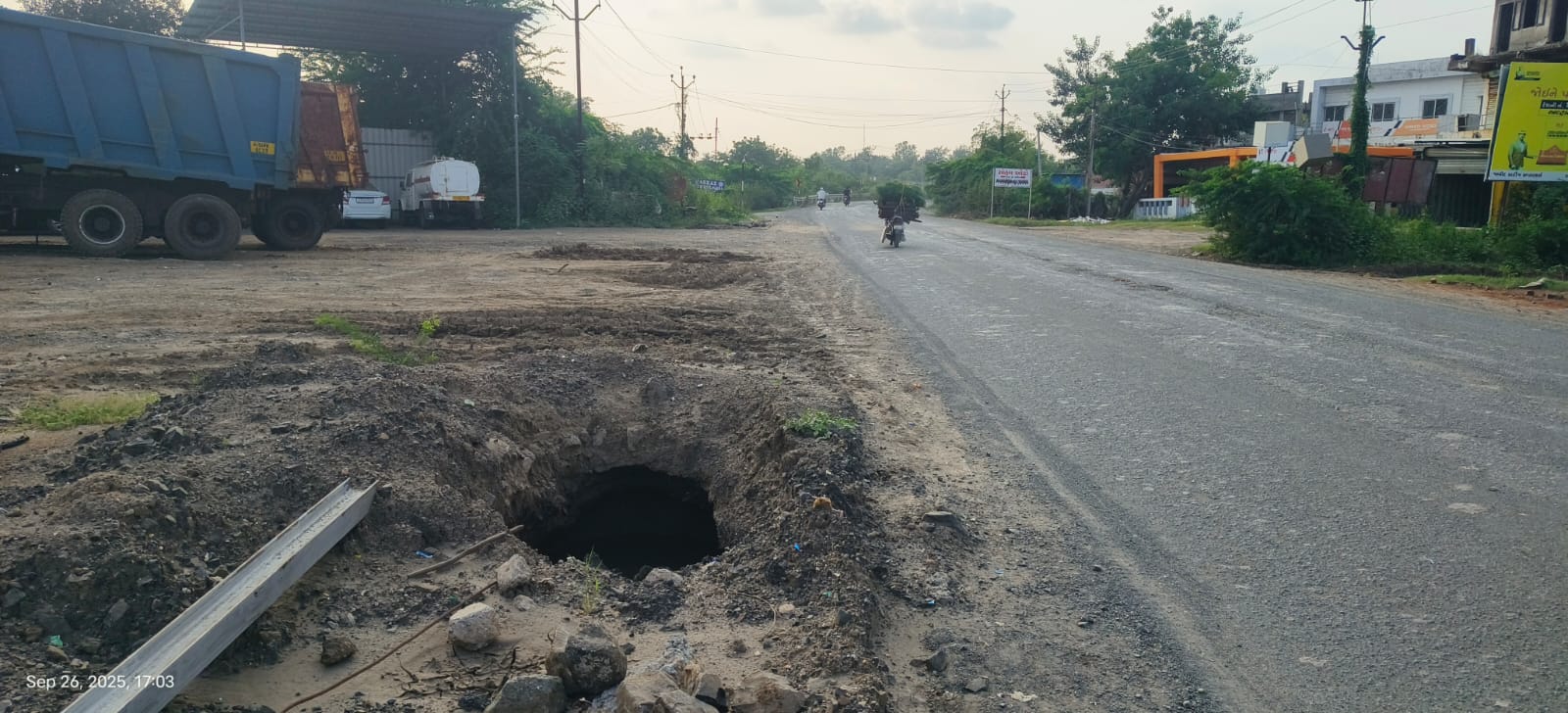 કાયદાનો ભંગ અને જાહેર સંપત્તિનું નુકસાન! : બેદરકારી માત્ર ખાડા પૂરતી સીમિત નથી. કંપની પર સરકારશ્રીની ગાઈડલાઈનનો ભંગ કરવાનો પણ આક્ષેપ છે. નિયમ મુજબ રોડથી ૧૫ મીટર સુધી કોઈ પણ પ્રકારનું બાંધકામ કે દબાણ કરી શકાતું નથી. તેમ છતાં જી.ઇ.બી ચોકડી પાસે KP ગ્રુપની પાઇપોનો મોટો જથ્થો આડેધડ રીતે પડતર હાલતમાં છે. જે તાત્કાલિક દૂર કરવા માંગ કરાઈ છે. વળી કામગીરી દરમિયાન સારણ જતા ટર્નિંગ પાસે અંડરગ્રાઉન્ડ કેબલ નાખતી વખતે માર્ગની બાજુમાં લગાવેલા દિશા સૂચક બોર્ડ પણ તોડી પાડવામાં આવ્યા છે. શું આટલી હદે જાહેર સંપત્તિની બેદરકારી અને નુકસાન દાખવવું યોગ્ય છે?