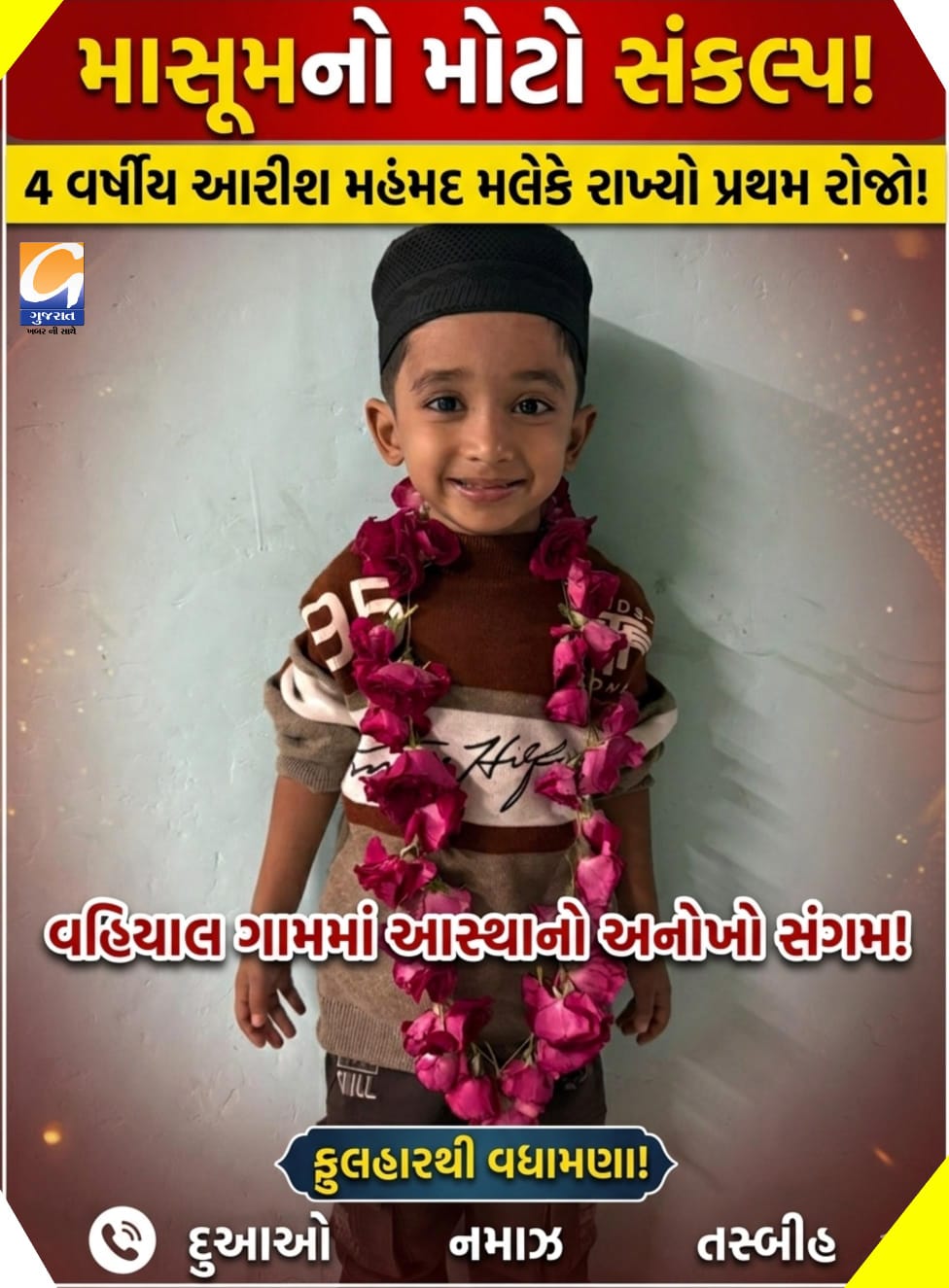 કાળઝાળ ગરમીમાં માસુમ બાળકે અડગ રહી રોજો પાળ્યો : સાંજે ઇફતારના સમયે પોતાનો પ્રથમ રોજો પૂર્ણ કરતાની સાથે જ આરીશે સૌપ્રથમ અલ્લાહની બારગાહમાં હાથ ઉઠાવીને સૌના માટે દુઆ માંગી હતી. આ ખુશીના પ્રસંગે પરિવારજનો દ્વારા આરીશને ફૂલહાર પહેરાવી, કપાળે બોમી અને શાબાશી આપીને તેનું ભવ્ય સ્વાગત કરવામાં આવ્યું હતું. ઘરના વડીલો અને સંબંધીઓએ આ માસૂમ બાળકના ઇમાન અને હિંમતને બિરદાવી તેને દુઆઓ અને આશીર્વાદ આપ્યા હતા. ચાર વર્ષના આરીશે રોજો પૂર્ણ કરીને એ સાબિત કરી બતાવ્યું છે કે ઈશ્વર પરની આસ્થા અને મજબૂત ઈચ્છાશક્તિ હોય તો કોઈ પણ કાર્ય અશક્ય નથી. આ ઘટના સમગ્ર વાગરા પંથકમાં ચર્ચાનો વિષય બની છે અને સૌ કોઈ આ માસૂમ બાળકની પ્રશંસા કરી રહ્યા છે.