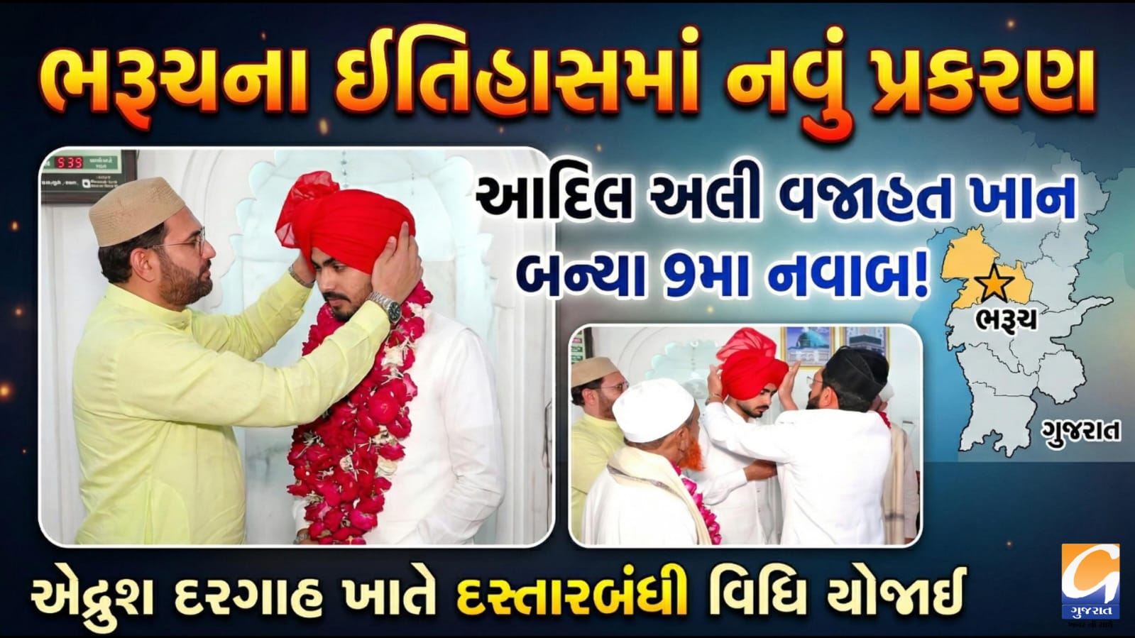 ભરૂચના ઇતિહાસમાં નવું પ્રકરણ, આદિલ અલી વજાહત ખાન બન્યા ભરૂચના 9મા નવાબ, એદ્રુશ દરગાહ ખાતે યોજાઈ દસ્તારબંધી વિધિ.
