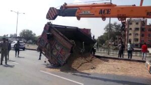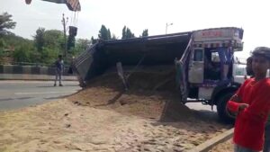 અંકલેશ્વરમાંથી પસાર થતાં નેશનલ હાઇવે પરથી પસાર થઇ રહેલી રેતી ભરેલી ટ્રકના પાછળના ટાયરની કમાન નીકળી જતાં મોટો અકસ્માત થતાં સહેજમાં રહી ગયો હતો. ભરૂચ અને સુરત વચ્ચેના હાઇવે પર અકસ્માતોની વણઝાર અટકવાનું નામ લઇ રહી નથી. બુધવારે સવારના સમયે અંકલેશ્વરની આમલાખાડી પાસે રેતી ભરેલી ટ્રકના પાછળના ટાયરની કમાન તુટી ગઇ હતી. પાછળના ટાયર નીકળી જતાં ટ્રક પલટી મારી ગઇ હતી. અકસ્માતના કારણે હાઇવે પર થોડા સમય માટે વાહનોની કતાર લાગી હતી. ક્રેઇન બોલાવી પલટી મારી ગયેલી ટ્રકને સીધી કરીને વાહનવ્યવહાર રાબેતા મુજબ કરવામાં આવ્યો હતો. પલટી મારી ગયેલી ટ્રકના ડ્રાઇવરનો આબાદ બચાવ થયો હતો.