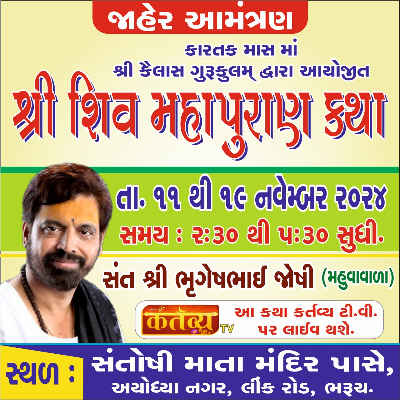 ભરૂચ: આગામી 11 થી 19 નવેમ્બરના રોજ શ્રી ભૃગેષભાઈ જોષી(મહુવાવાળા)ના શ્રીમુખે શ્રી શિવ મહાપુરાણની કથા યોજાશે November 10, 2024